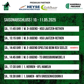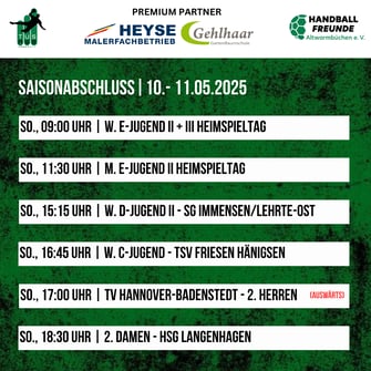 Am 10. und 11. Mai 2025 möchten wir gemeinsam mit euch unseren Saisonabschluss im Helleweg feiern. Zehn Teams laufen – teilweise zum letzten Mal in der Saison – in unserer Halle am Helleweg auf. Seid dabei und lasst uns noch einmal die Halle voll machen!