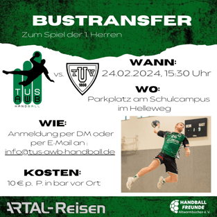 Am Samstag, dem 11.11.2023, spielt unsere 1. Herren um 17:00 Uhr auswärts gegen die HSG OHA. Hierzu wird es einen Bustransfer für mitreisende Fans nach Herzberg hin und zurück geben. Wir treffen uns am 11.11.2023 um 13:30 Uhr auf dem Parkplatz am Schulcampus im Helleweg. Anschließend werden wir uns mit einem Bus von Artal Busreisen gemeinsam auf den Weg machen. Die Rückfahrt erfolgt nach dem Spiel. Bitte meldet euch vorher über die Kommentarfunktion oder per E-Mail...
